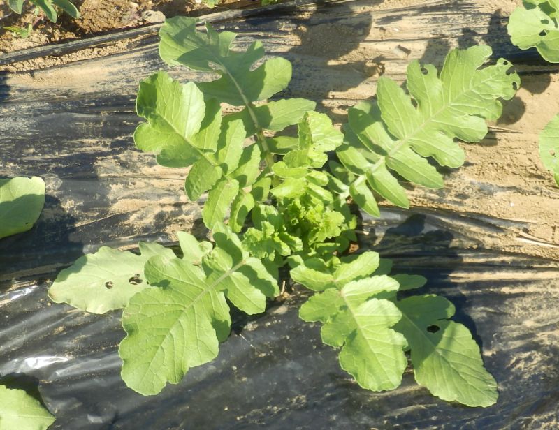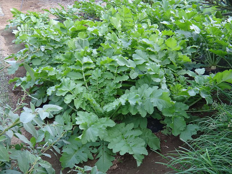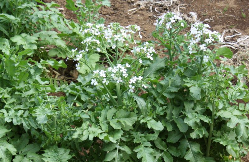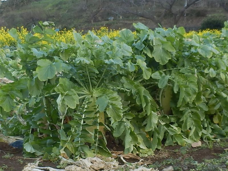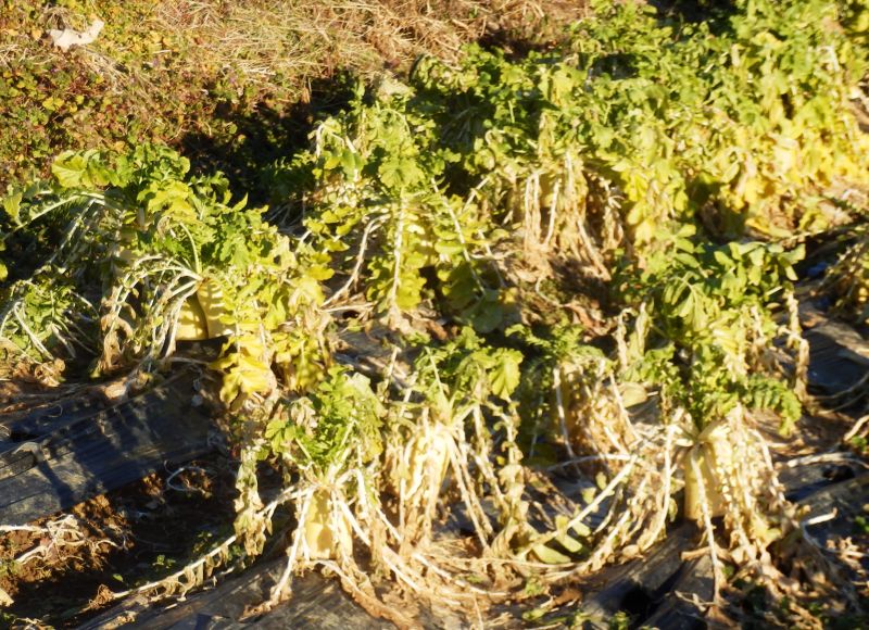 地面が凍るとダイコンの地上部も凍って食べられなくなる。(2011/1/12)