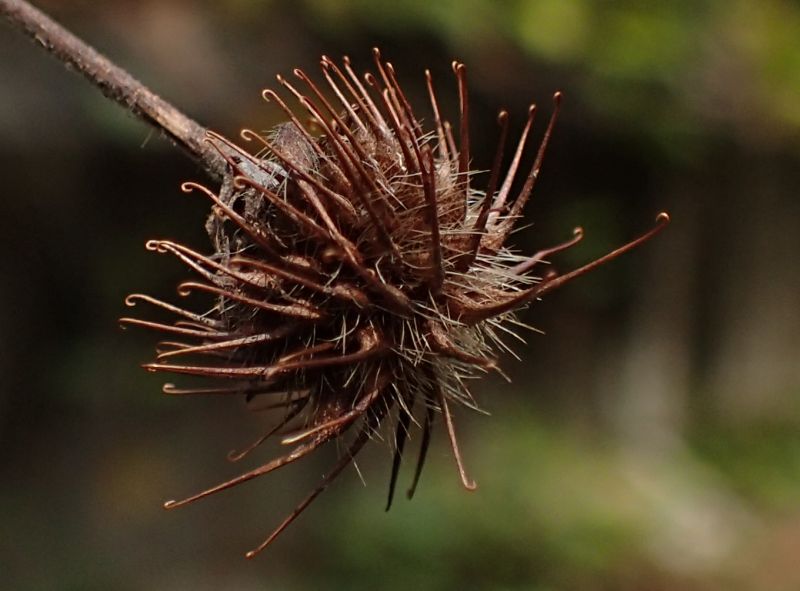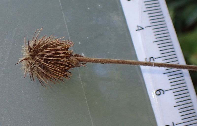 熟した果実。柱頭が長い突起として残り、その先が鉤状となる。