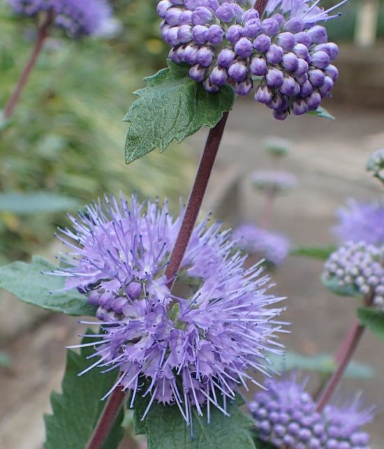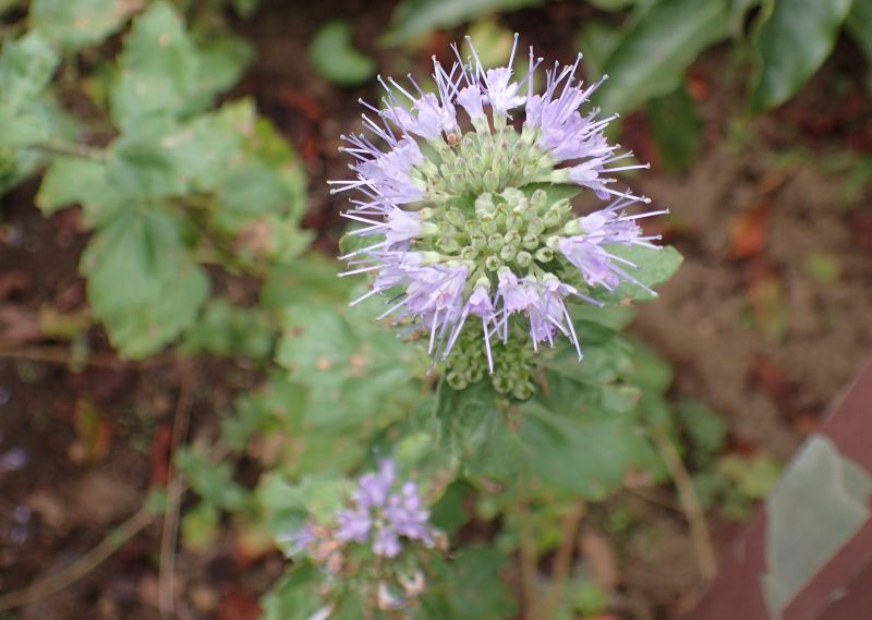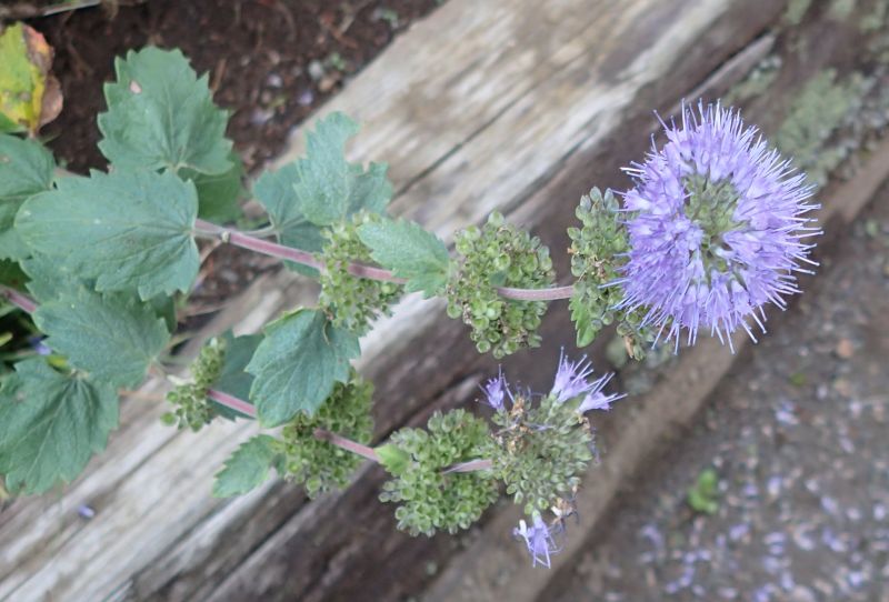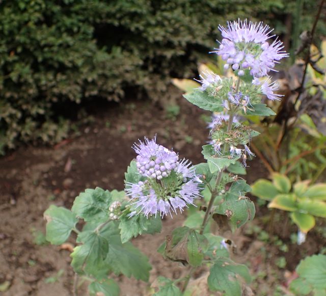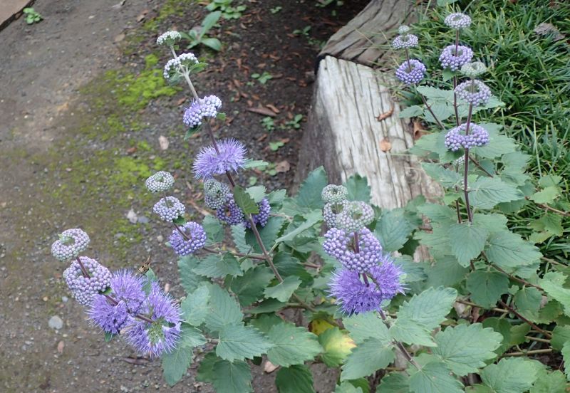 淡青紫色の花が集散状に集まり、それが多段になってつく。