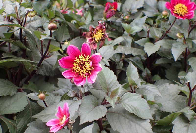 ダリア属、球根植物、筒状花と舌状花をもつ、多年草。