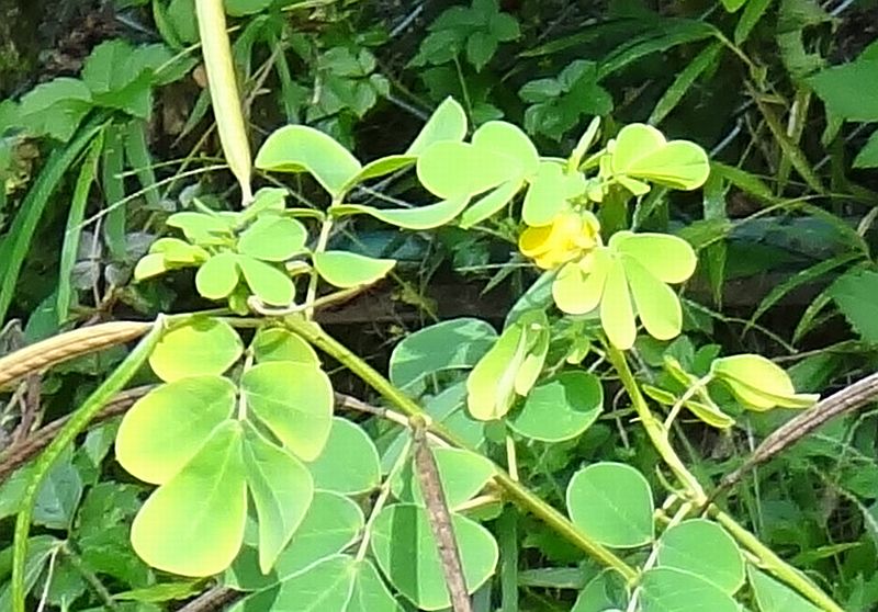 葉腋に(蝶形ではなく)いびつな黄色い5弁花を1輪か2輪ずつ咲かせる。