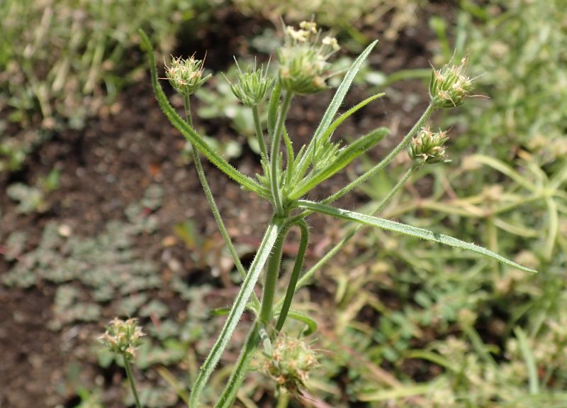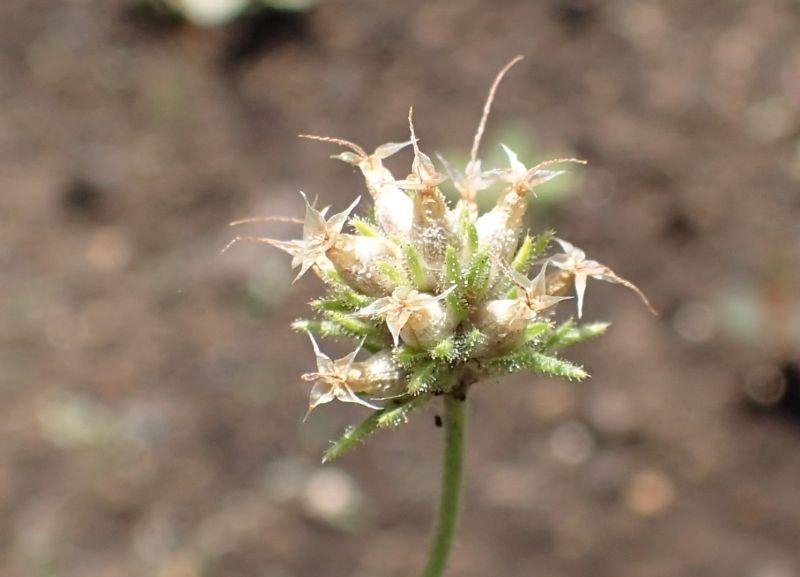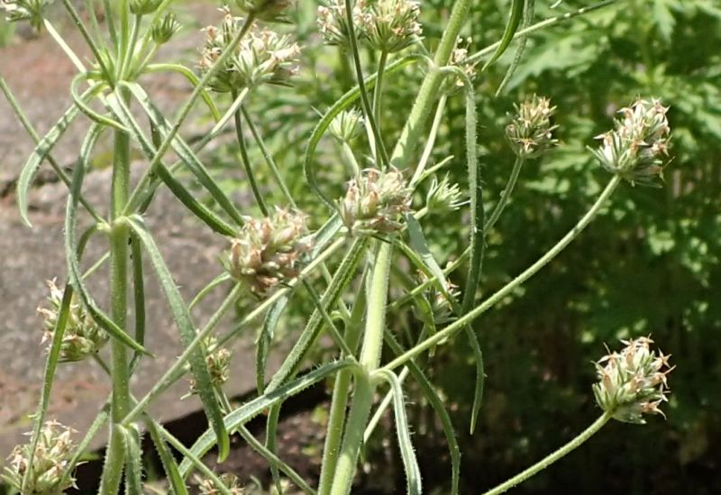 上部の葉腋から花柄をいくつも出し、白い小花を多数頭状につける。