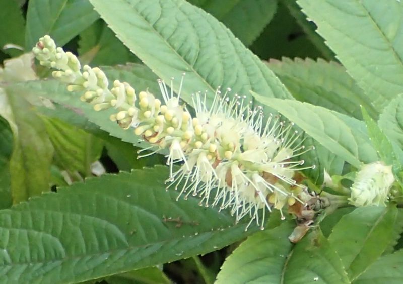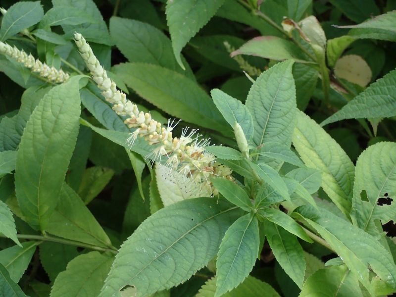 葉は先のとがった長楕円形で葉柄があって鋸歯があり、対生する。