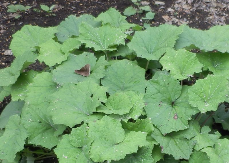 葉身は5〜7角形でフキの葉に似ており、鋸歯がある。