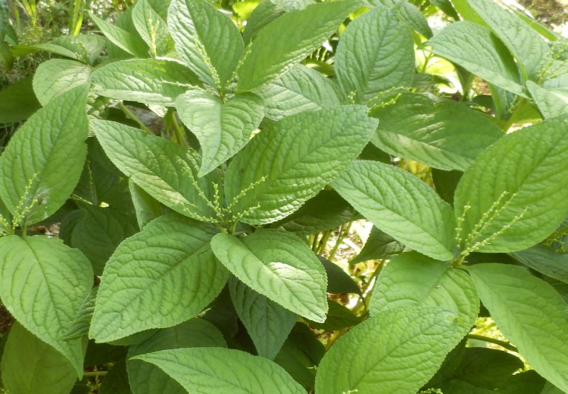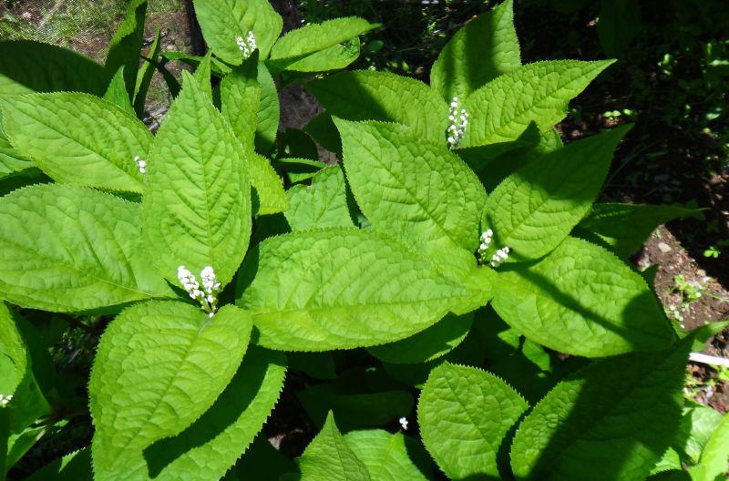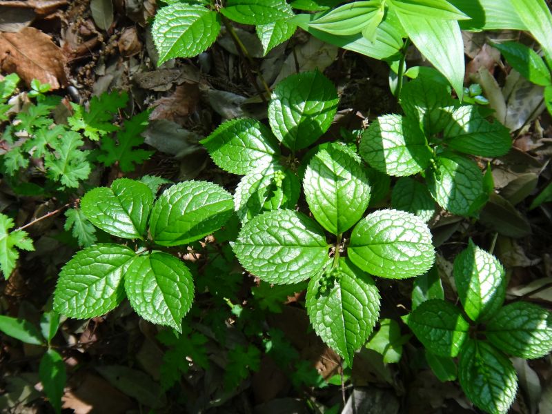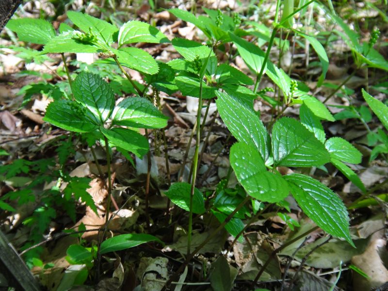 葉は楕円形で鋸歯があり、細い茎先に数組対生する。