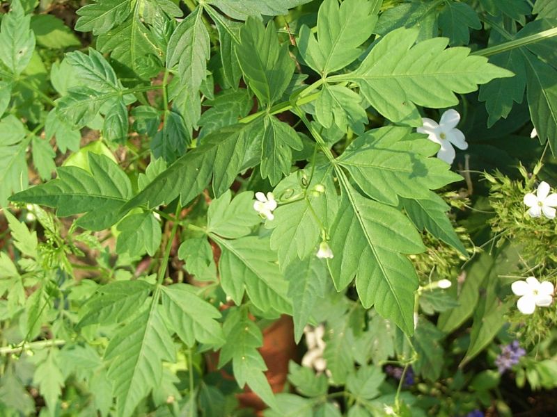 葉は2回3出複葉で互生し、小葉は卵形で粗い鋸歯があり、柔らかい。