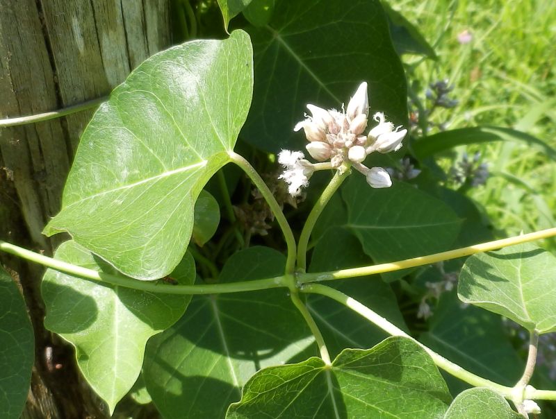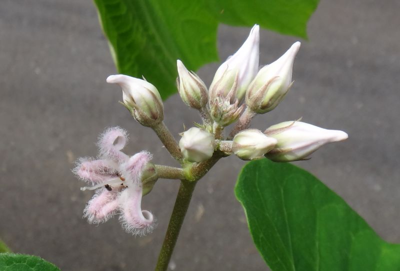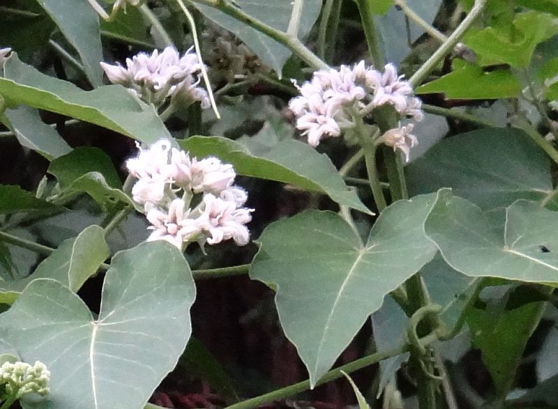葉腋の散形花序に淡紫色〜白色の花が咲く。