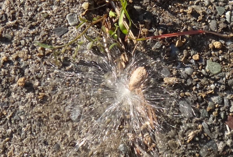 種子は楕円形で、その毛は太陽でキラキラ光る。