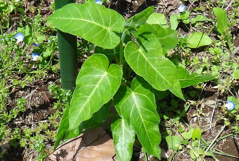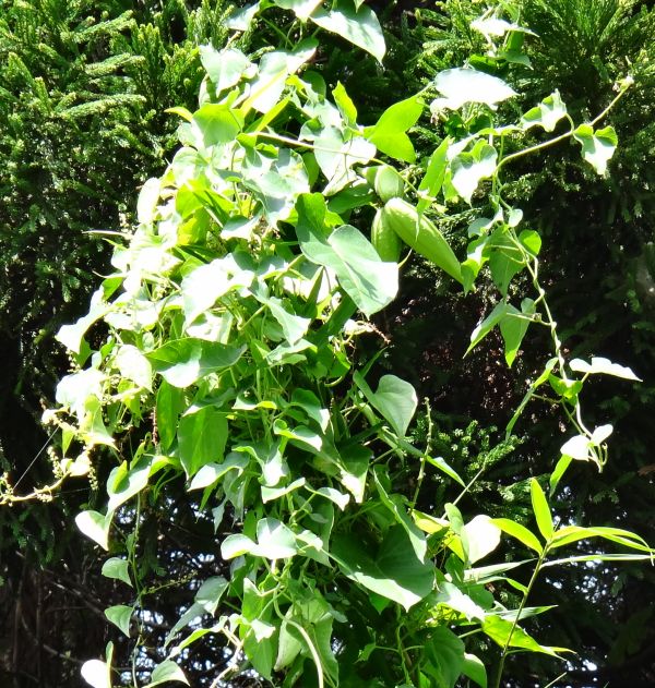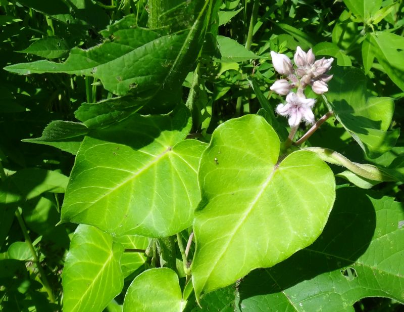 葉は先のとがった長さ5〜10センチの長卵状心形で対生し、