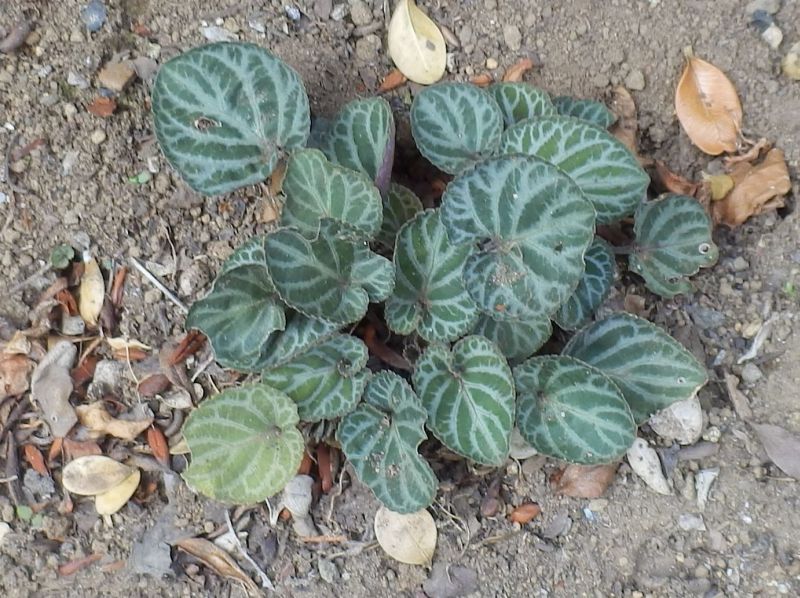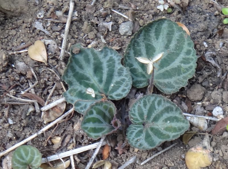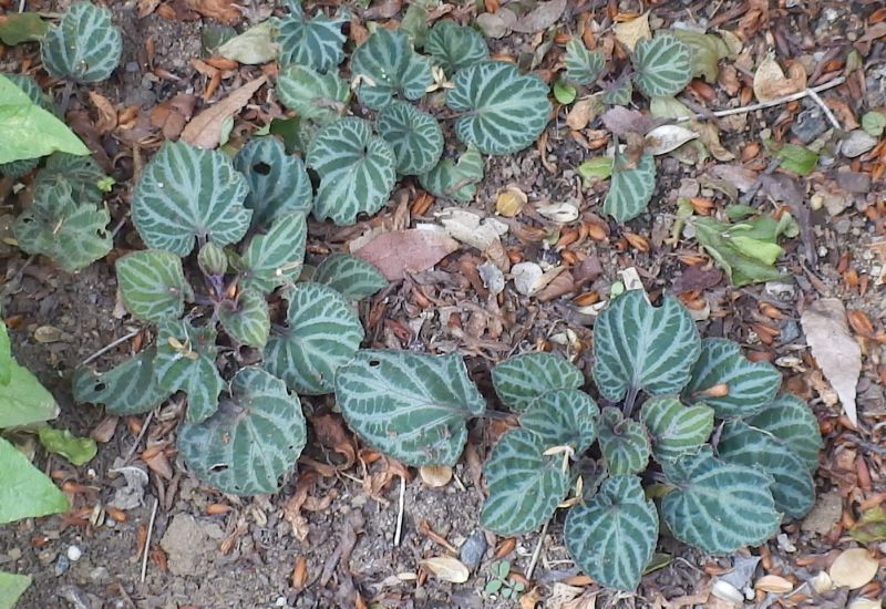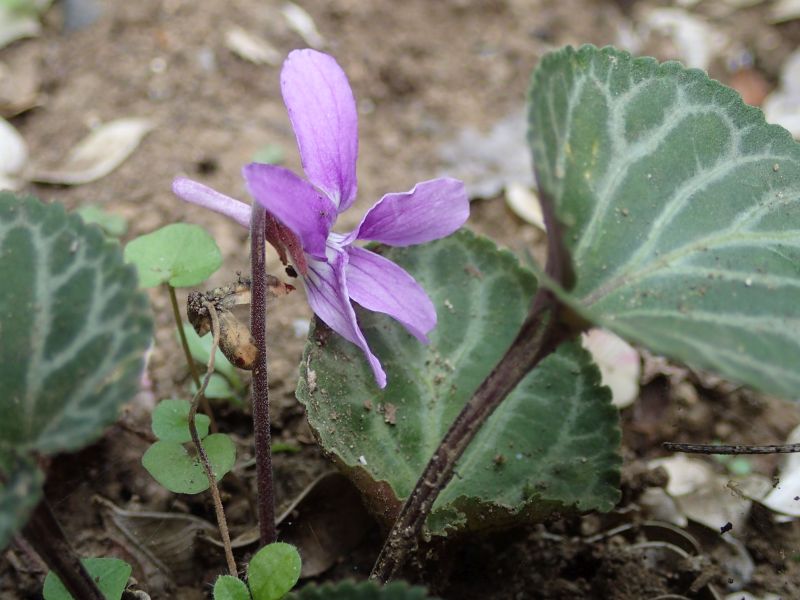 地上茎:無、花色:淡紅紫色、葉:円心形裏面紫、距:太長い、花柱:頭状。
