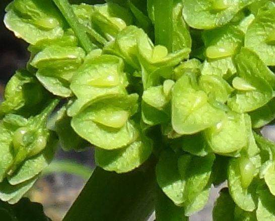 ナガバギシギシ:葉の基部が心形で、茎の先に緑色の花序を出し、そう果の翼には鋸歯がない。