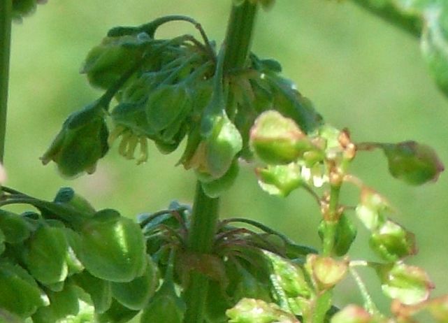 エゾノギシギシ:葉は基部が心形で、ギシギシより幅広で大きく、花穂は黄褐色、そう果の翼に棘がある。