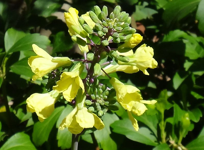 冬を越して春に茎が伸びて、その先に黄色い4弁花が総状に咲くが、