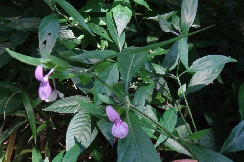 花は淡紅色で、基部は扁平だが先が上下2枚の唇に分かれる。