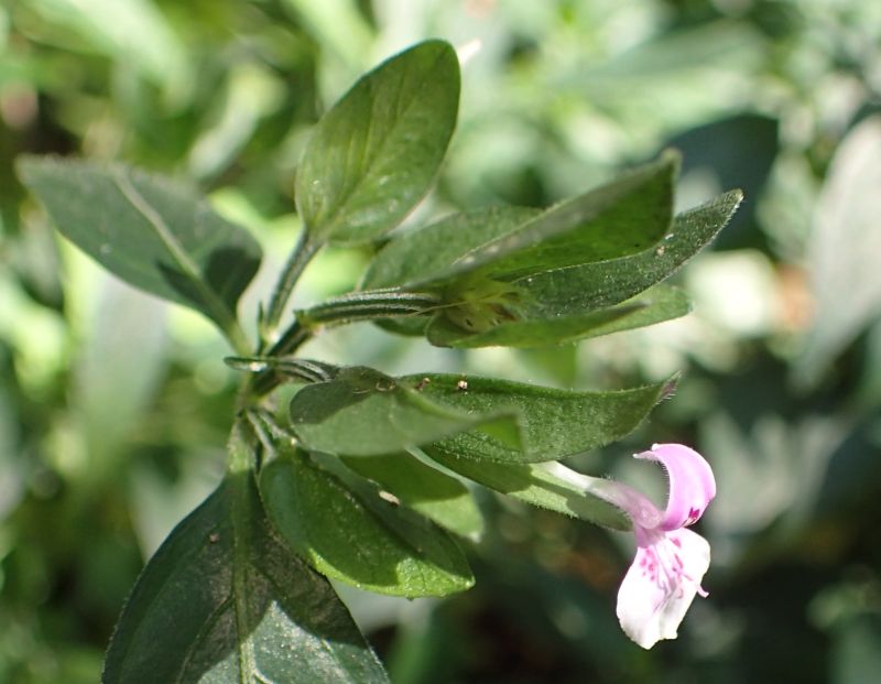 長さ2.5〜3センチの平たい花冠が上下2つに裂けて唇形となる。