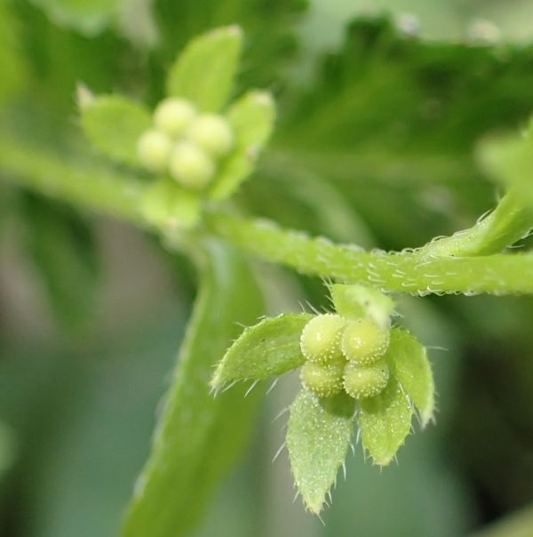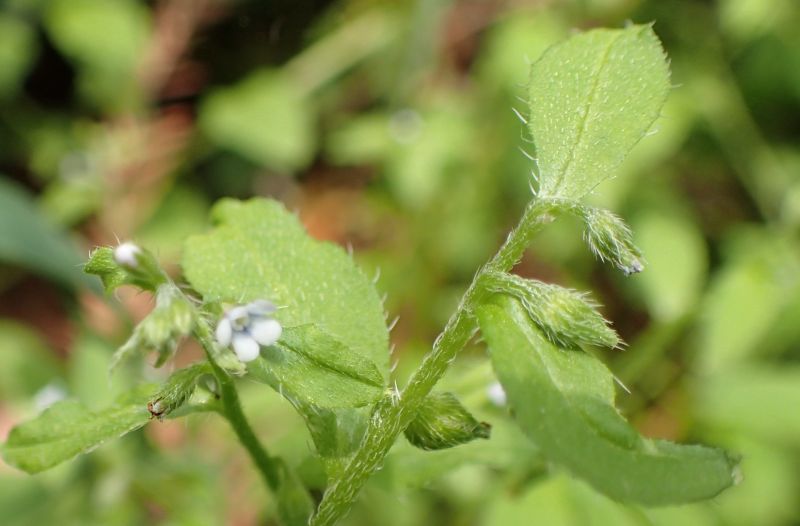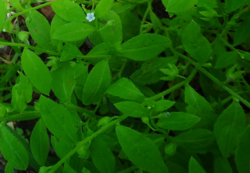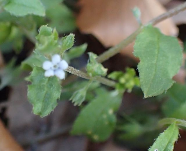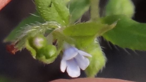 上部の葉腋に直径2〜3ミリの小さい青紫色の花をつける。