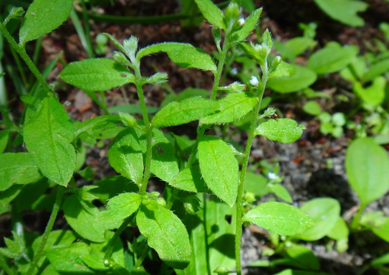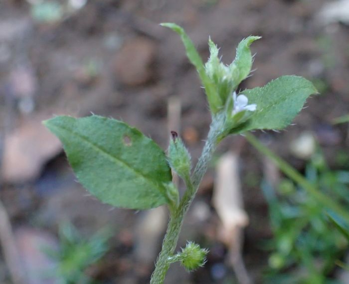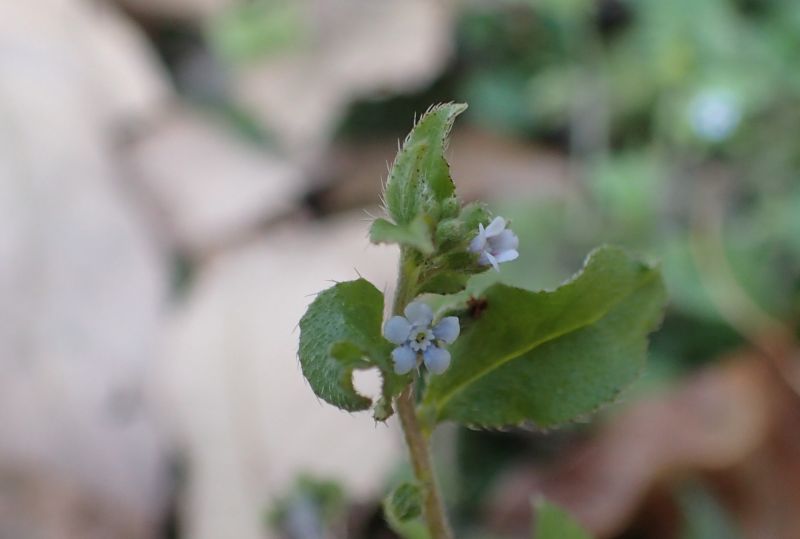 茎先では葉の上に乗るように咲く。茎や葉などに伏毛が多い。(2017/4/22)