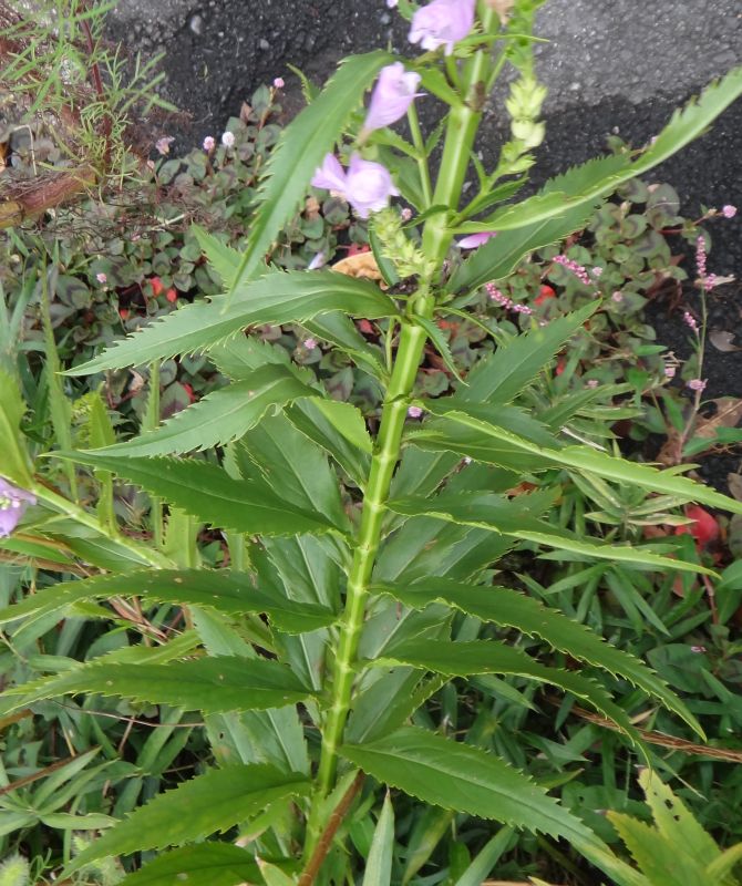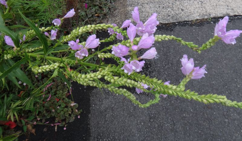 淡紅色の唇形花が斜上ないし横を向く。(2016/10/6)