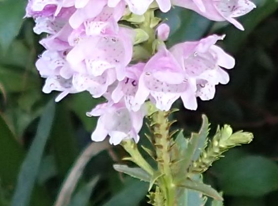 淡紅色や白の唇形花が四角柱形に密生し、先は四角錐形になる。