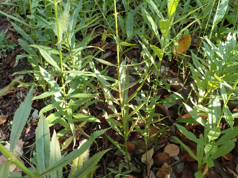 葉は披針形で鋭い鋸歯があり、茎を少し抱く。(2016/10/8)