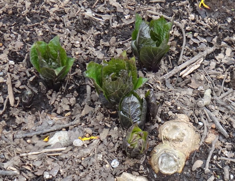 新芽は葉に包まれている。フキノトウと間違えると大変。(2016/3/16)