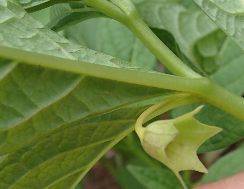 葉腋に釣鐘状の暗紫色で、