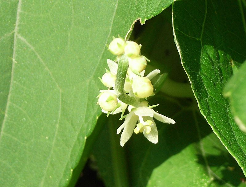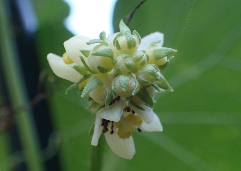 葉腋に花冠の5裂した淡黄色の花が頭状に集まって咲く。