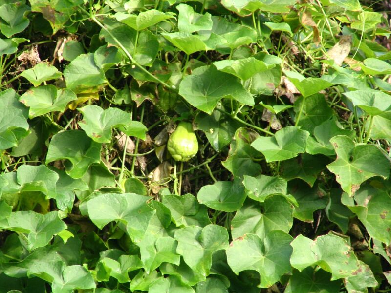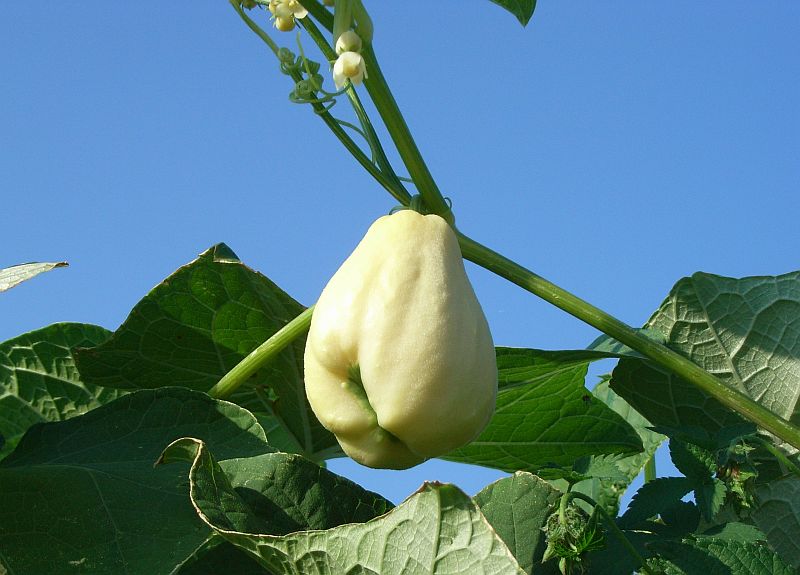 秋口に長さ10センチぐらいの洋梨形で淡黄緑色の果実ができる。