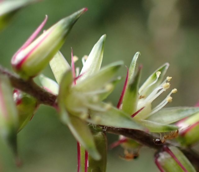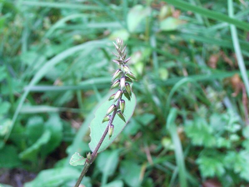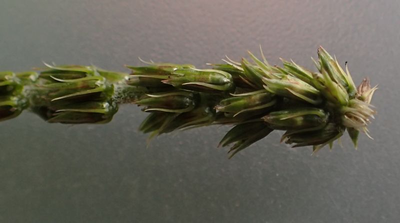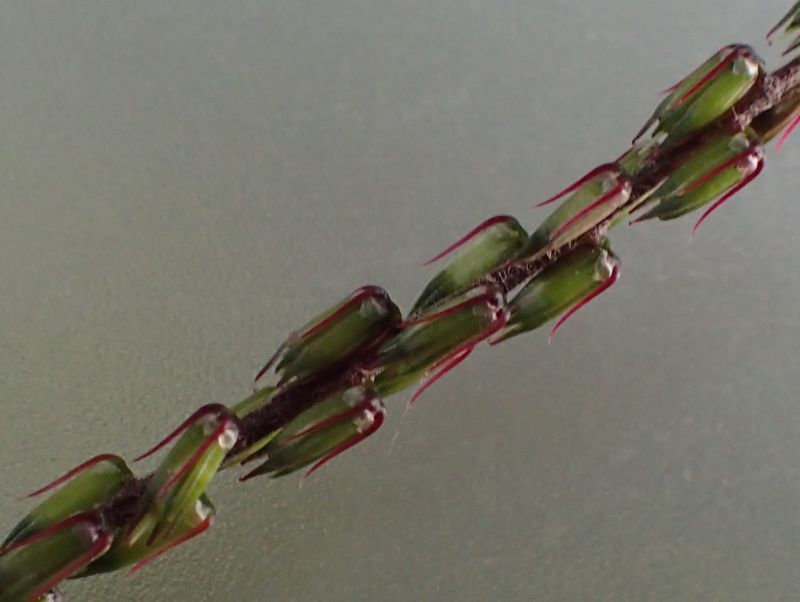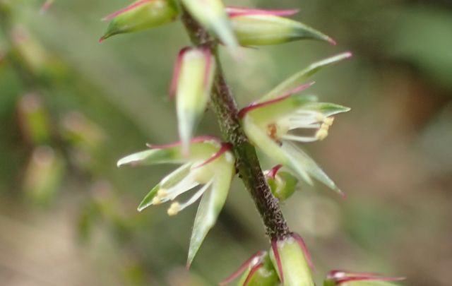 茎や枝の先に細長い花穂を出し、緑色の尖った米粒のような