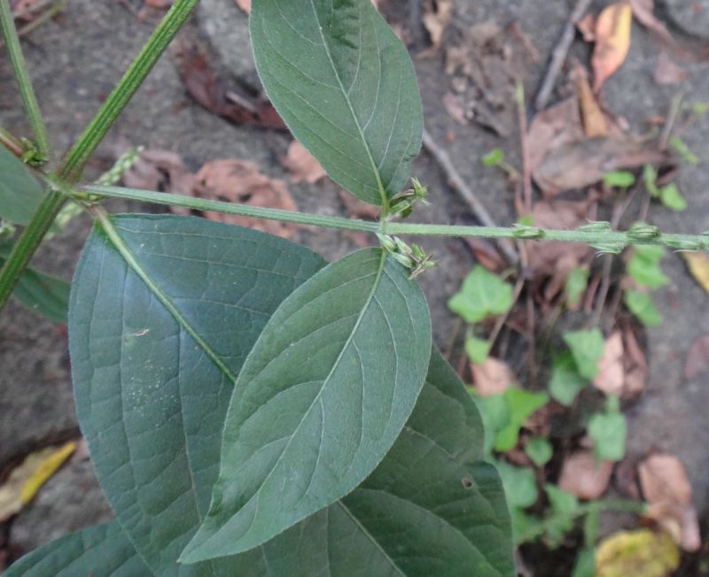 ヒナタイノコズチ:日向、葉が厚い、毛が多い(葉裏が白っぽい)、花が密につく、葉先が急にとがる、小苞の間の白い付属体が小さい。