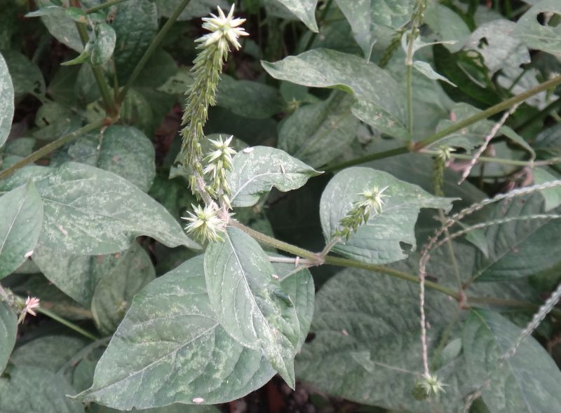マルバイノコズチ:日向、葉が厚い、毛が多い(葉裏が白っぽい)、花が密につく、葉先が丸い。