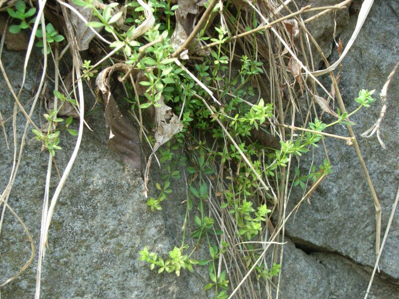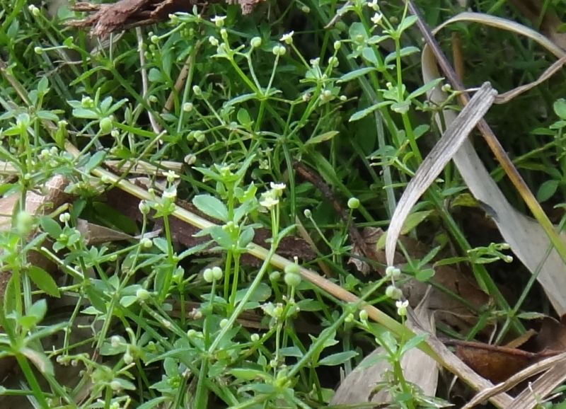 ヤエムグラ :茎の稜に棘、1〜3センチの広線形の葉が6〜8輪生、花4弁、果実に毛。