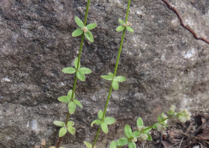 ヨツバムグラ :茎は無毛、0.6〜1.5センチの尖った長楕円形の葉が4輪生、花は4弁、果実に突起。