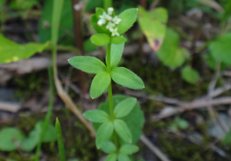 ホソバノヨツバムグラ:茎の毛わずか、0.7〜1.4センチの狭長楕円形の葉が4輪生、花は通常3弁、果実無毛。