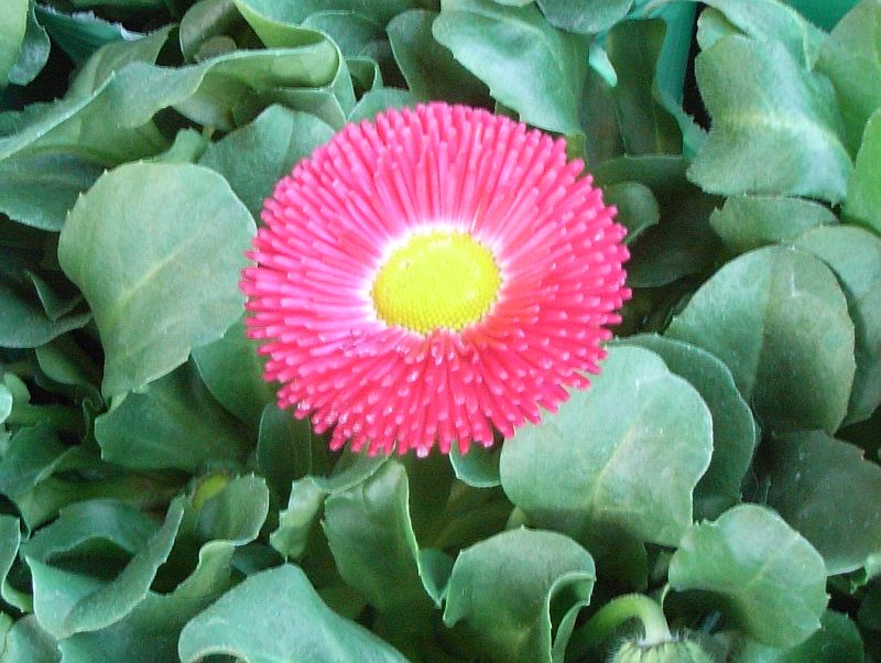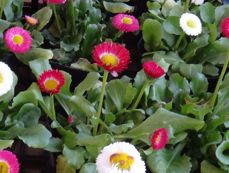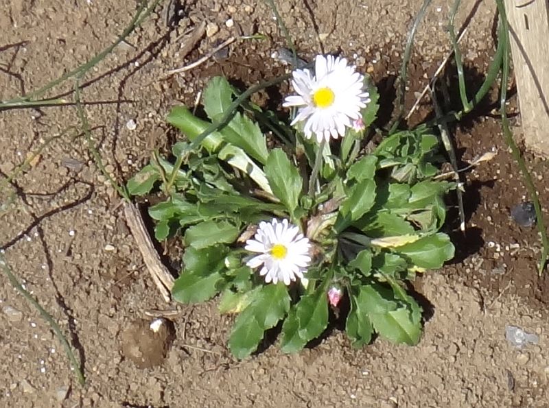 ヒナギク属、舌状花と筒状花をもつ。秋蒔き1年草。