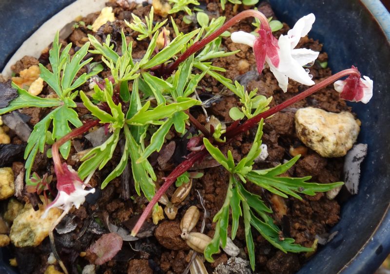 地上茎:無、花色:白〜紅紫色、葉:羽裂、距:太長、花柱:頭状?。