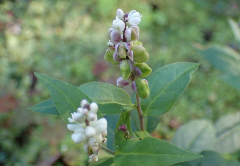 枝先の総状花序に小さい白〜緑白色の蝶形状の花を咲かせる。