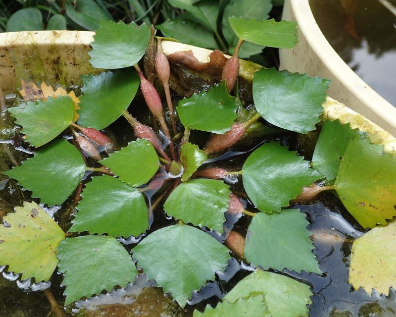 3角状の葉が水面に浮き、葉柄に紡錘形の浮き袋がある。(2016/7/28)