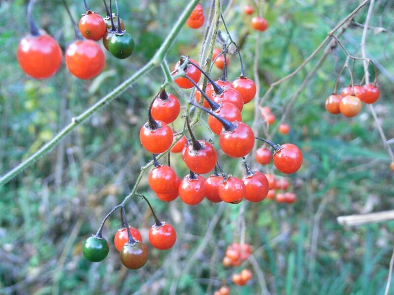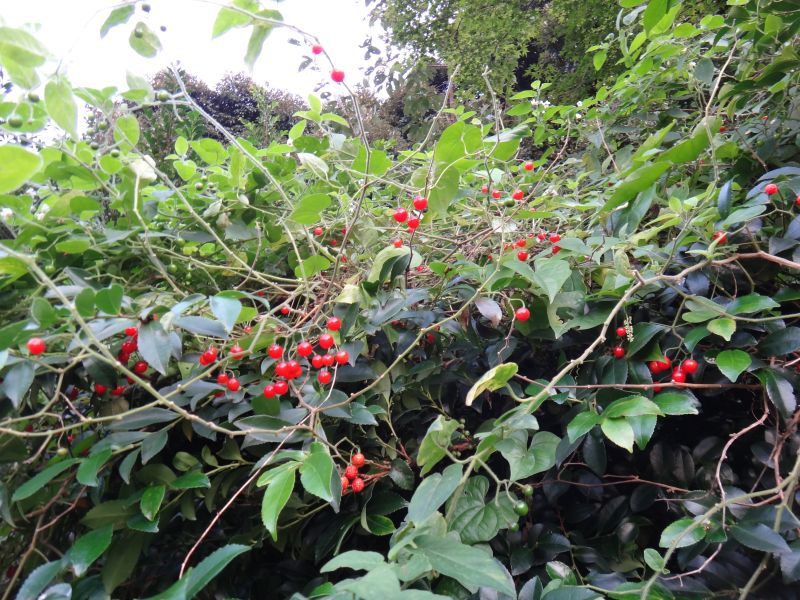 秋に丸くて赤い液果を総状にまばらにつける。