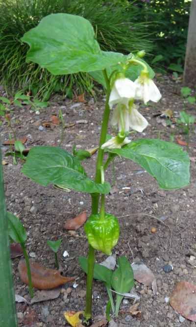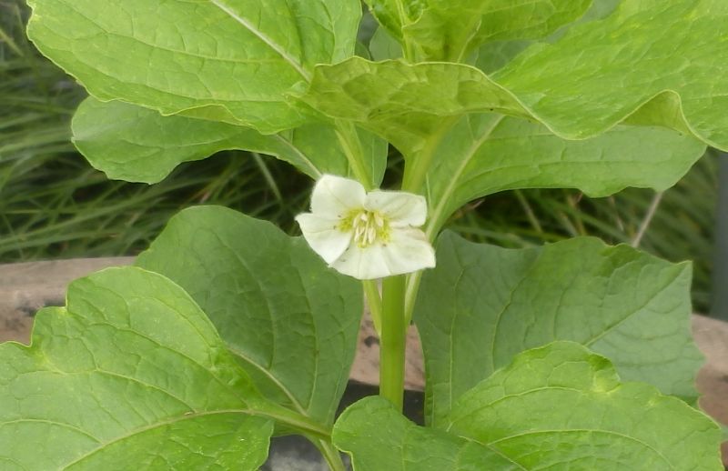 夏に葉腋から出る花柄の先に淡黄白色の花を単生させる。