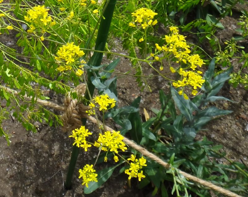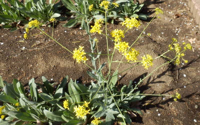 枝先の総状花序に黄色い4弁花が密集して咲く。