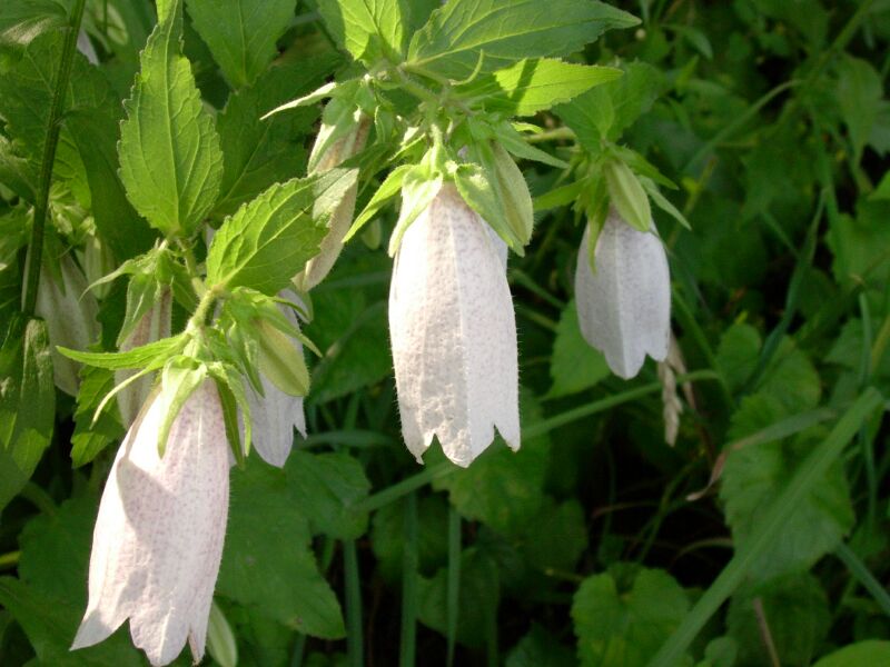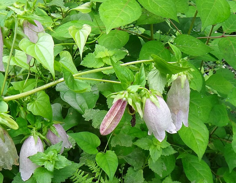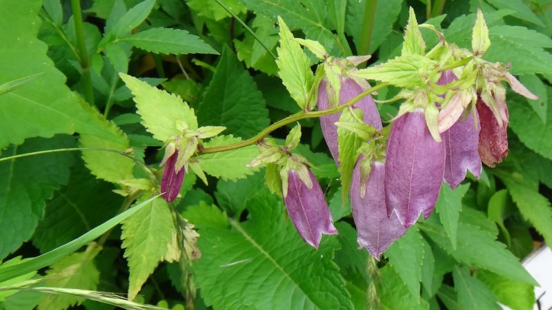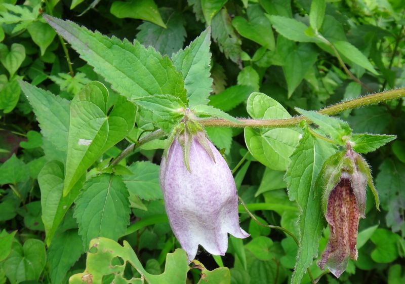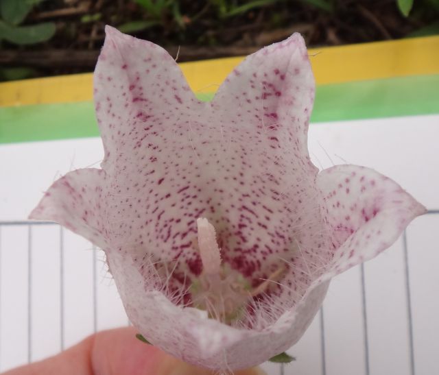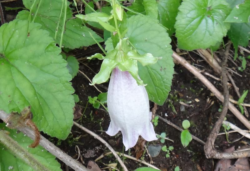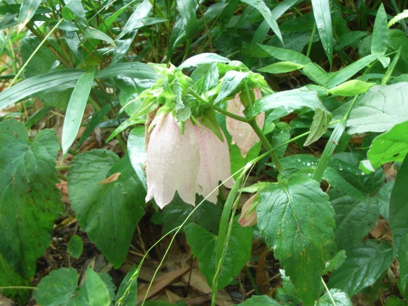 茎の上部の葉腋に、長さ4〜5センチの釣鐘状で、