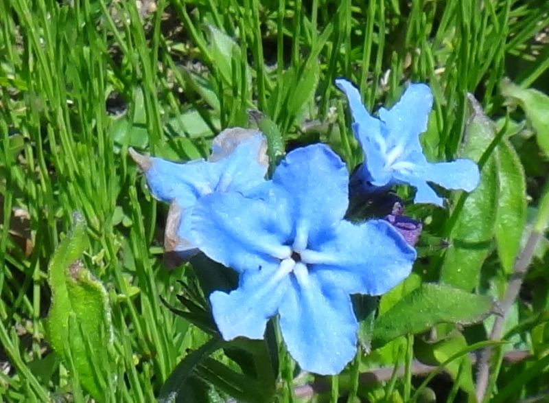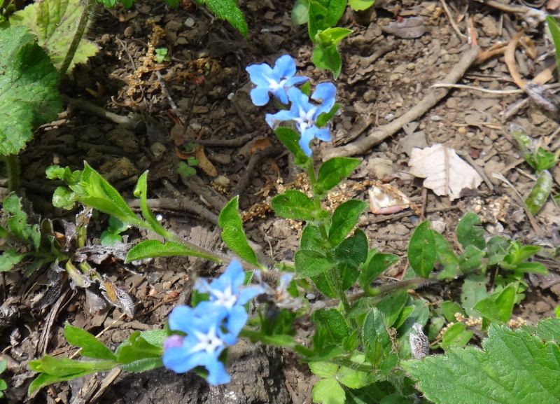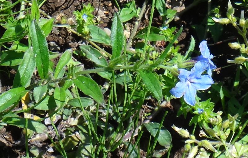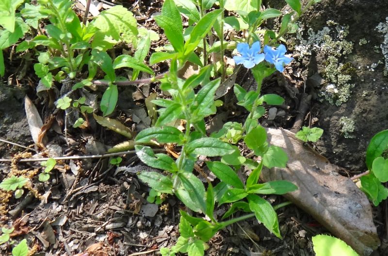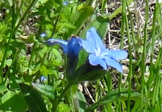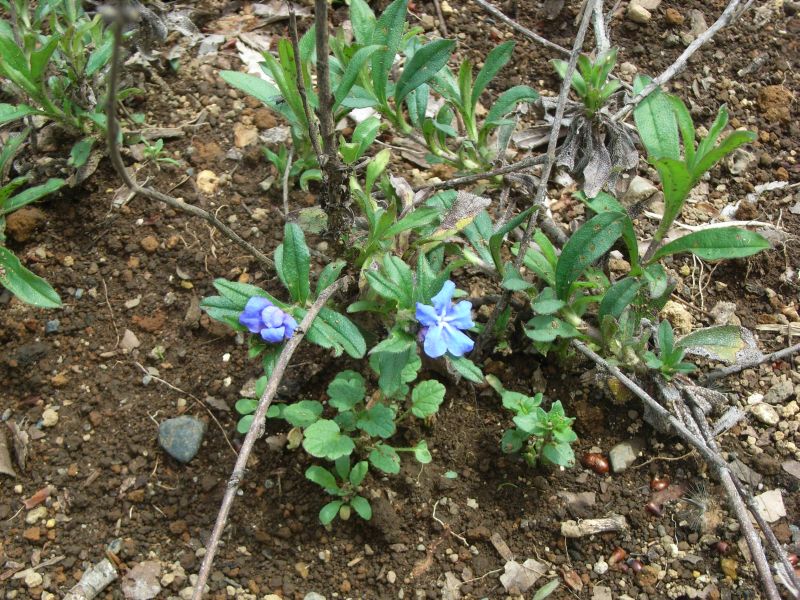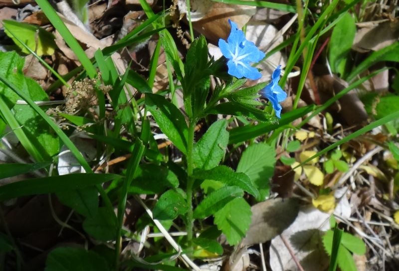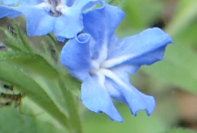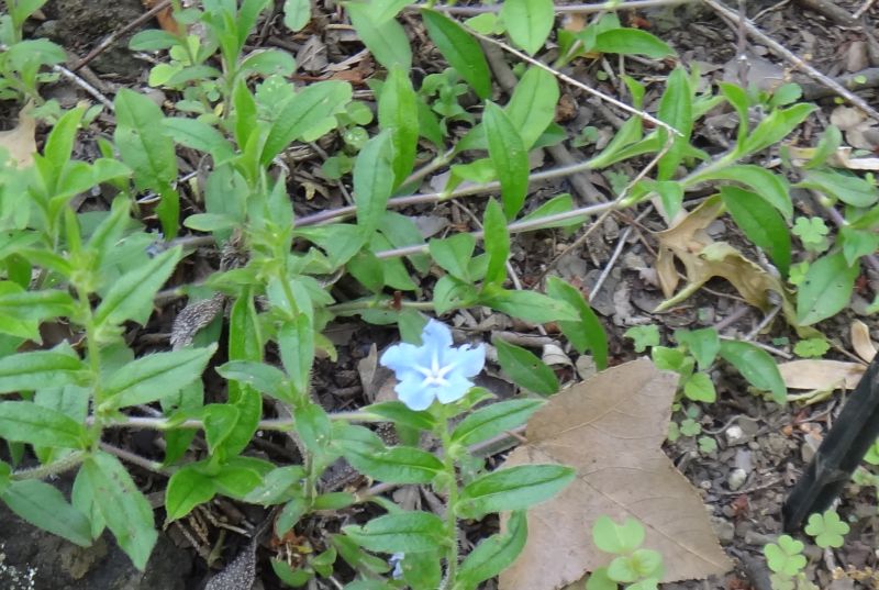 花は直径1.5〜2センチで上部の葉腋に1個ずつつき、青紫色の花冠は5裂し、