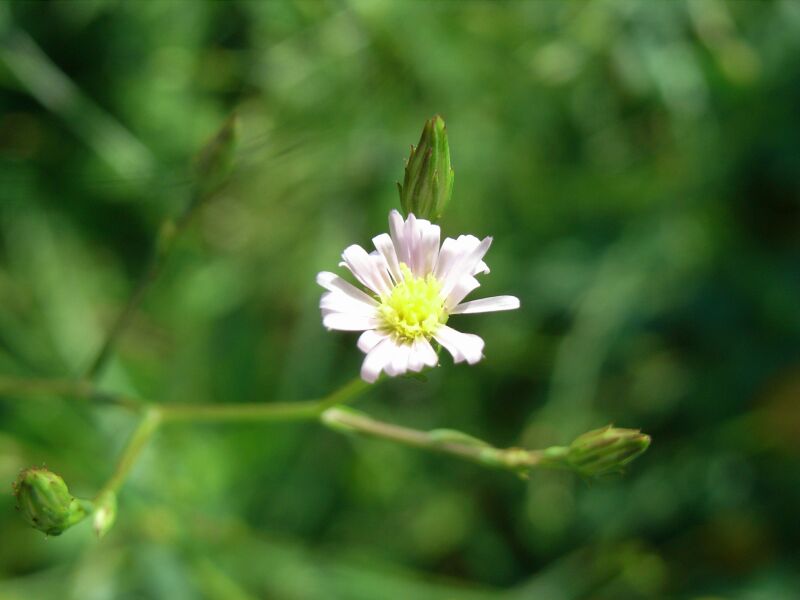 舌状花は白く、稀に淡紫色で、筒状花は黄色い。
