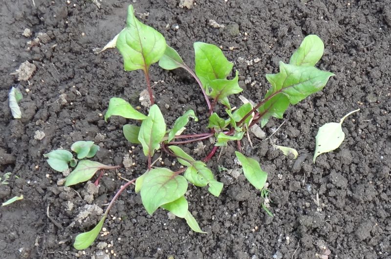 葉柄の付け根や根が淡赤色で、果実が丸い。