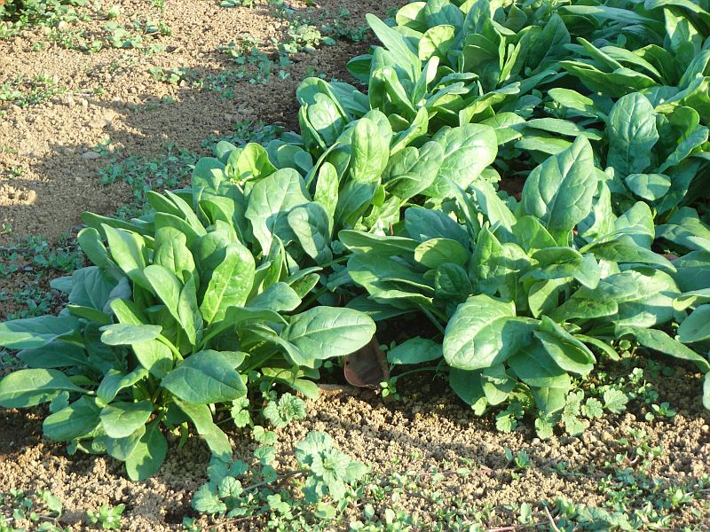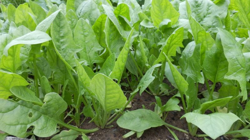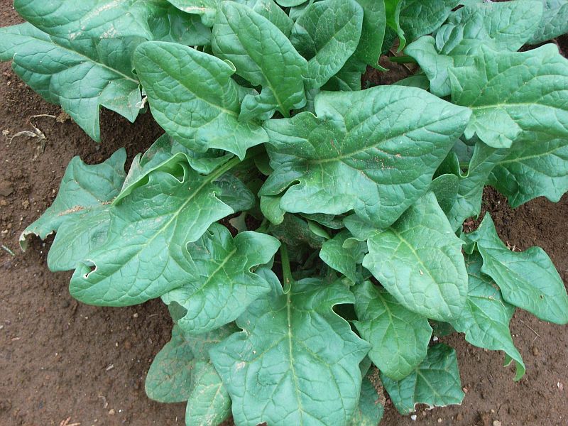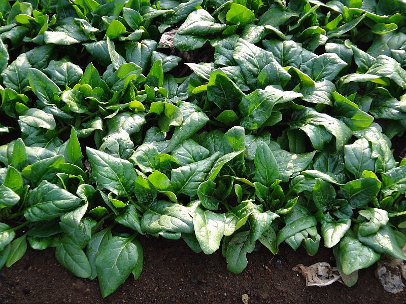西洋ホウレンソウ。葉が厚くて葉先がやや丸い。