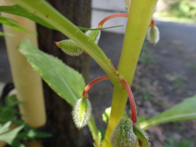 後部に細長い距のある花が葉腋に数個つく。(2017/10/26)
