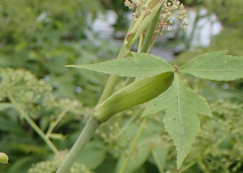 花序の出ている所の葉柄の基部は鞘状となり、茎を抱く。(2016/7/27)
