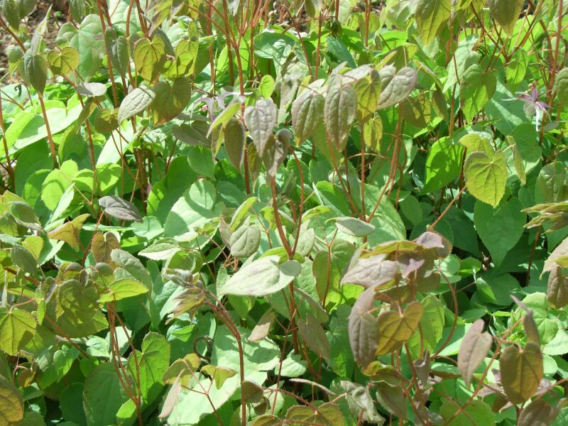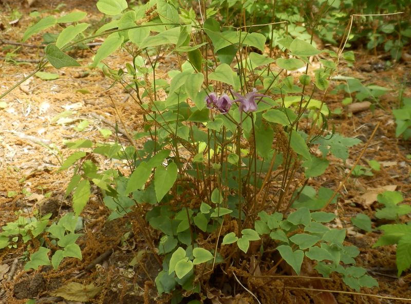 イカリソウ :夏緑、距が長い、花は紫色、葉につやがない。