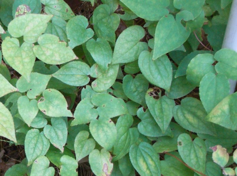 バイカイカリソウ:常緑、距なし、花は白く小さい、葉はゆがんだ卵形。